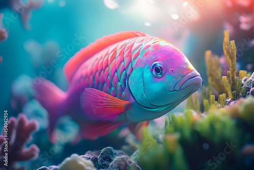Fototapeta premium A single colorful fish swimming in a vibrant coral reef with bright light...