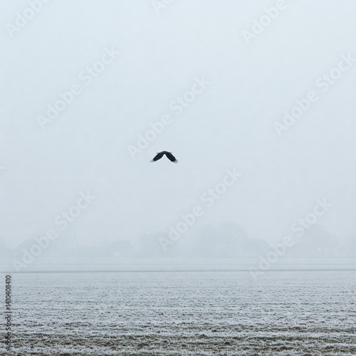 © Hamidbajwa, Fototapeta premium A Single Crow Flies Over Frosted Farmland Under Pale Sky