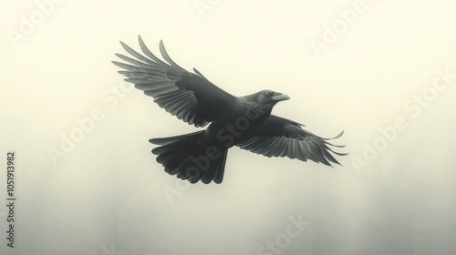 © artiiz, Fototapeta premium A single crow flying far above, a small black silhouette against a pale morning sky, photorealistic