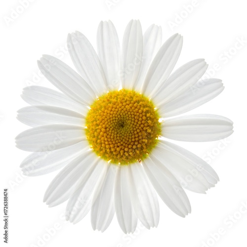 Fototapeta premium A single daisy, viewed from above, showcases its white petals and yellow center against a stark white backdrop