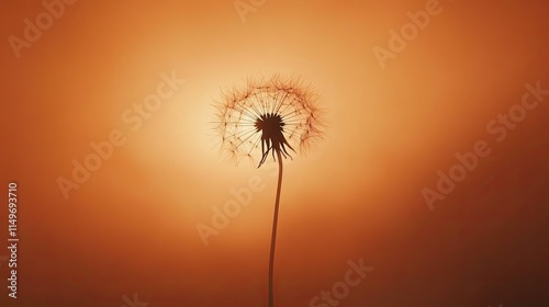 © Sirinya, Fototapeta premium A single dandelion seed head silhouetted against a glowing orange sunset sky, symbolizing hope and beauty in simplicity.