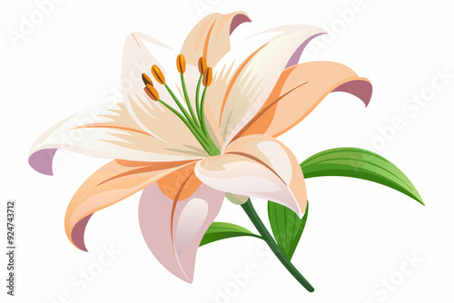 Naklejka premium A Single Delicate Peach-Colored Lily Flower with Green Stem and Leaves