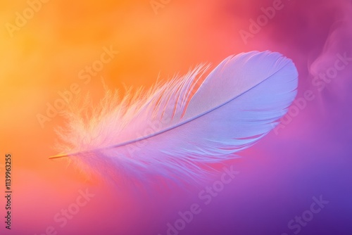 Obraz premium A single, delicate white feather floats against a vibrant orange and purple...