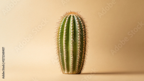 Naklejka premium A single desert cactus with a thick, ribbed surface, standing tall against a pale sand-colored background