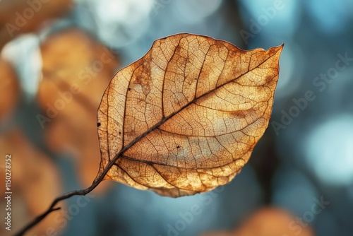 © BabyEyes, Fototapeta premium A single dried leaf backlit showing intricate veins