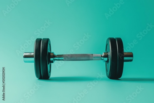 Naklejka premium A single dumbbell sits in a clean turquoise colored background
