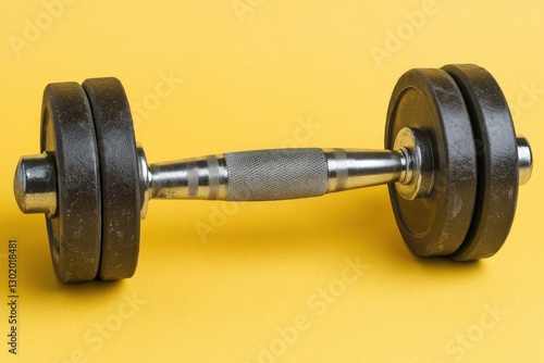 Fototapeta premium A single dumbbell with plates rests upon a vibrant yellow backdrop