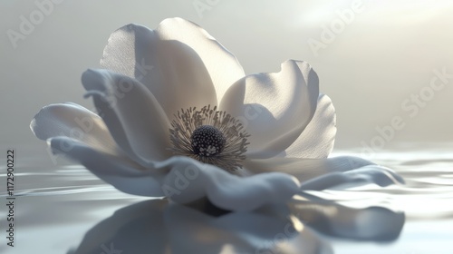 Obraz premium A single elegant anemone bloom lying on a glossy surface, its intricate...