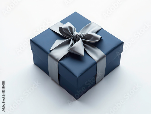 © Танюша Коновал, Obraz premium A single elegant gift box placed on a pristine white background. The box is square-shaped, wrapped in glossy midnight blue paper