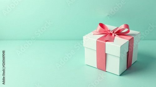 Fototapeta premium A Single Elegant Gift Box with a Delicate Pink Ribbon on a Soft Mint Background