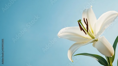 Fototapeta premium A single elegant white lily against a serene sky blue background, close-up shot, Minimalist style