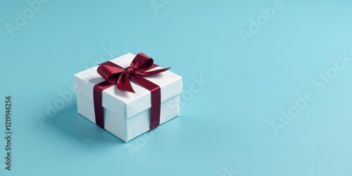 Obraz premium A single, elegantly wrapped present with a maroon ribbon sits on a light blue...