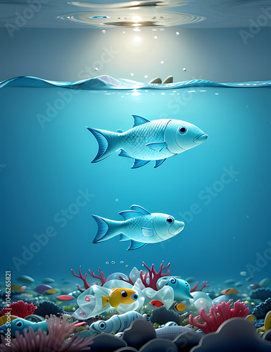 Naklejka premium A single fish swimming in a sea of plastic, symbolizing the environmental...
