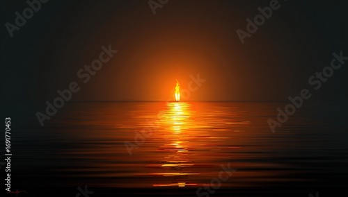 Fototapeta premium A single flame, reflecting on still water, against a dark, muted background