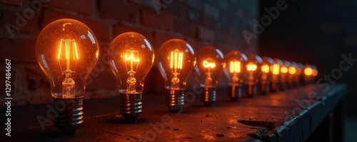 Obraz premium A single glowing light bulb in a row of extinguished ones, casting an eerie glow, shadows, darkness