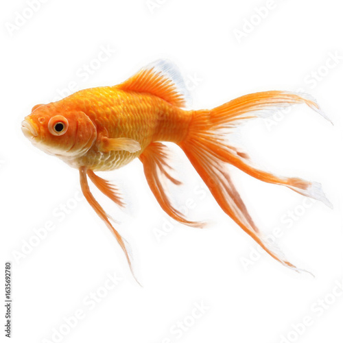 Fototapeta premium A Single Goldfish Swimming Upright, its Fins Flowing in Elegant Motion on White.