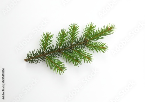 © Vooglo.com, Obraz premium A single green fir branch with needles lying on a white surface in a studio shot close up view top down