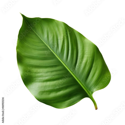 © stockpro, Fototapeta premium A single green leaf isolated on a white background, showing detailed texture and vibrant color.