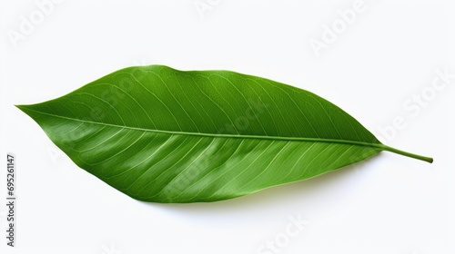 Obraz premium A single green leaf placed on a white surface. Suitable for various uses