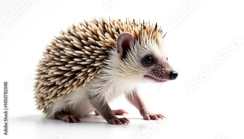 © Sourithideth, Fototapeta premium A single hedgehog, facing right, against a bright white backdrop, nature, adorable, photography