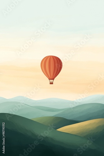 © sch_ai, Fototapeta premium A single hot air balloon floating above rolling hills where the balloon and hills are created using large smooth shapes