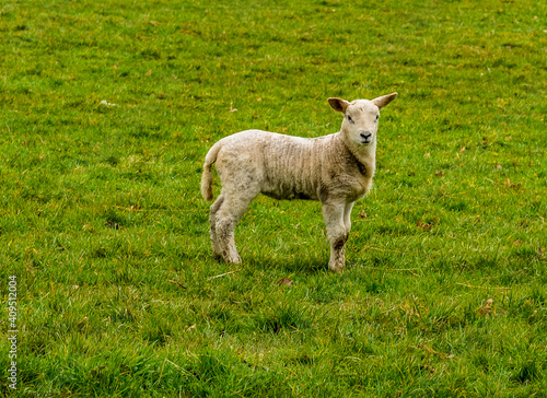 © Nicola, Fototapeta premium A single lamb alert in a field near Market Harborough, UK
