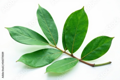 © Anulak, Fototapeta premium A single large eucalyptus leaf on a white background, leafy, nature
