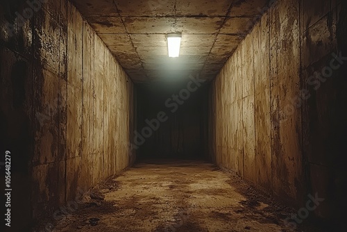 © Outkast, Fototapeta premium A Single Light Illuminating a Dark Concrete Corridor