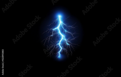© joeycheung, Obraz premium A single lightning bolt is shown in the center of the image, bright white against a dark blue and black background.