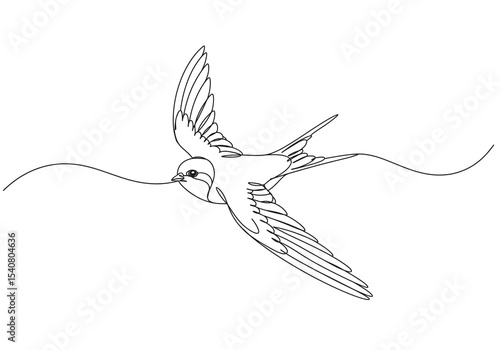 Fototapeta premium A single line drawing of a swallow in flight with a piece of straw in its beak on a white background