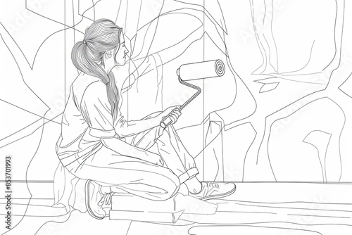 Obraz premium A single line drawing of a woman painting a wall with a roller. concept illustration on home repair, renovation, and freshening up. Generative AI