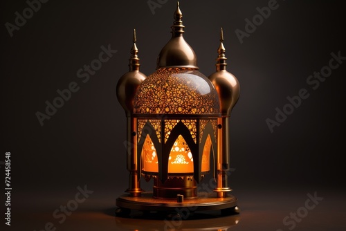 Obraz premium A single lit lantern providing gentle illumination, placed on a solid table surface, Religious islamic lamp, AI Generated