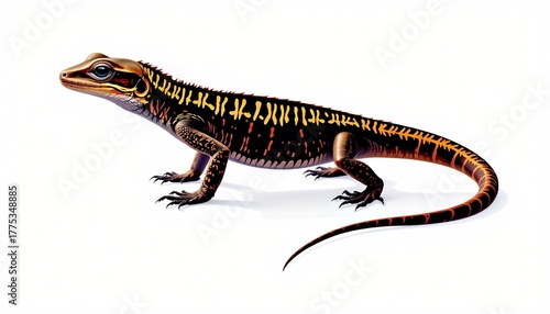 © MakeitEasy, Obraz premium A single lizard with distinctive red and yellow markings on its body standing against a white background.