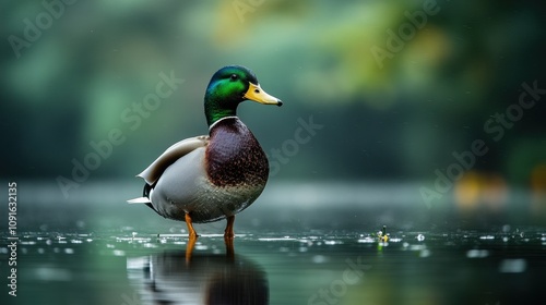 © irawan710, Fototapeta premium A single male mallard duck stands on a calm pond with a blurred green background.