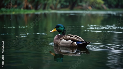 Obraz premium A single mallard duck swims in a tranquil pond, its reflection visible in the...