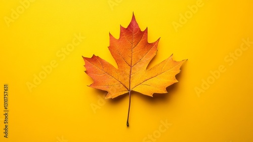 Fototapeta premium A single maple leaf displaying autumn colors on a yellow background