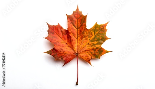 © Black, Obraz premium A single maple leaf with vibrant orange, red and green hues, lying on a stark white background