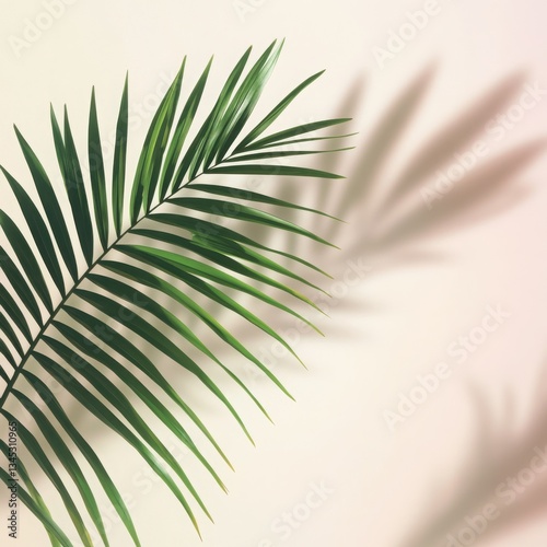 © Shahida, Fototapeta premium A Single Palm Frond Casts a Shadow Against a Beige Wall in Soft Lighting Minimalist Botanical Photography
