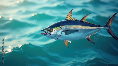 © Angel Pic, Naklejka premium A single pelagic fish gracefully glides through the aquamarine depths, its scales shimmering with an iridescent glow.