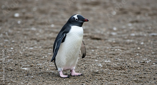 Naklejka premium A single penguin stands proudly on the sandy terrain