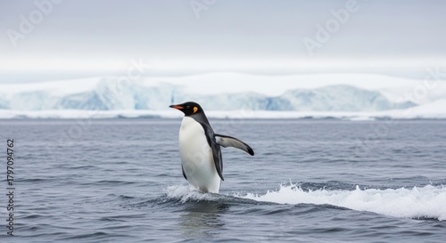 © zuni, Fototapeta premium A single penguin wades through the ocean water, with icebergs in the background.
