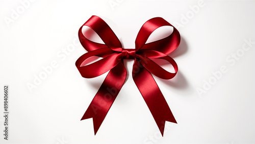 © Ashes Studio, Fototapeta premium A single, perfectly tied red satin ribbon bow rests on a plain white background.