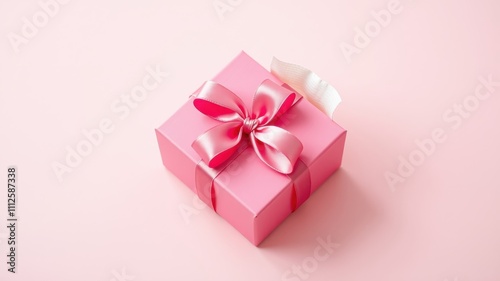 © sasiprapa, Obraz premium A single pink gift box with a satin ribbon bow on a pale pink background.