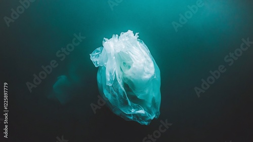 Fototapeta premium A single plastic bag submerged in dark teal water.