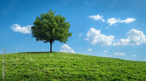 © CreativePulse, Fototapeta premium A single poplar tree stands on a lush grassy slope under a clear blue sky with drifting clouds, representing solitude and serenity.