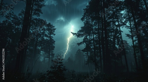 Fototapeta premium A single powerful lightning strike touching down in a dark forest,...