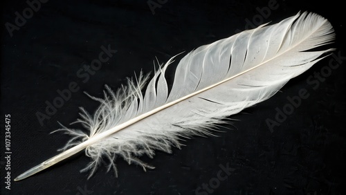 Obraz premium A single, pristine white feather isolated against a dark background, showcasing intricate detail and delicate texture.