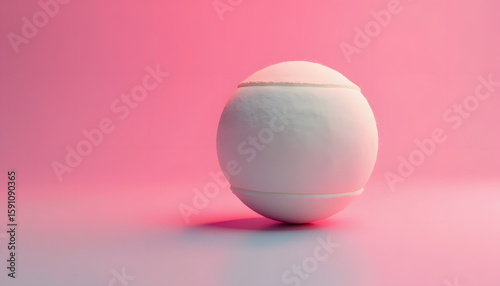 Fototapeta premium A single, pristine white tennis ball rests on a pale surface against a soft pink background.