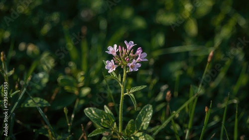 © Lasvu, Obraz premium A single purple flower blooming amid green grass and foliage.