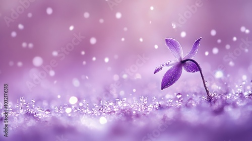 Fototapeta premium A single purple flower blooms in a field of dew drops.